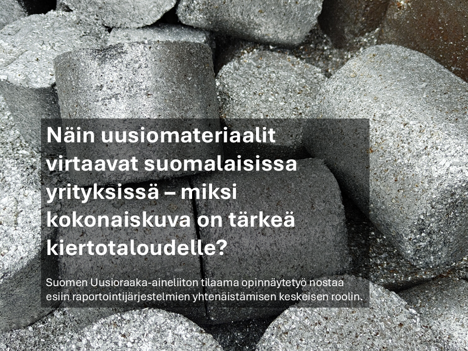 Suomen Uusioraaka-aineliiton tilaamassa opinnäytetyössä tutkittiin jäsenistömme uusiomateriaalitasetta. Vaikka Suomessa korostetaan entistä vahvemmin yhtenäisen tiedon roolia materiaalien kierrosta resurssiviisaan yhteiskunnan perustana, kiertotalouden toimijoita velvoittavat raportointijärjestelmät ovat edelleen hajanaisia.